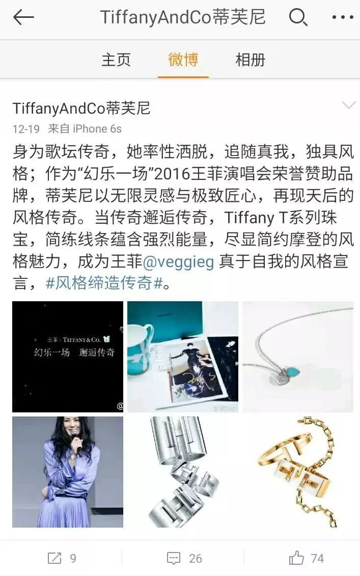 12月19日,Tiffany官微宣布Tiffany成为2016王菲演唱会荣誉赞助商。
