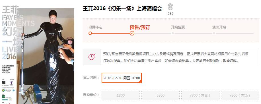 大麦网上王菲演唱会门票价格分为1800元、5800元、7800元3档,均已售罄。