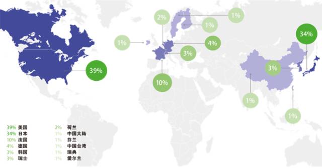 根据报告分析,全球百强企业中有39家企业来自亚太地区(其中日本34家、韩国3家、中国大陆1家、中国台湾1家),亚太地区正逐渐成为全球最具创新活力的市场。