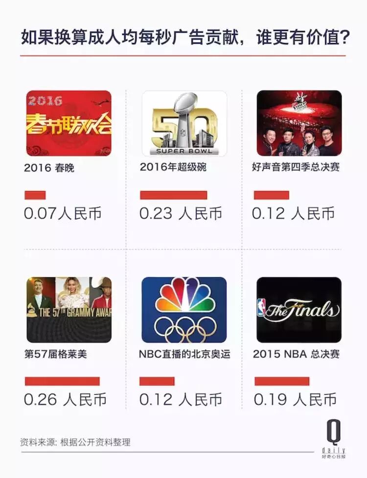 电视的式微已经不是什么新鲜话题,但就像我们在这篇文章 中分析的,在新媒体平台尚未孕育出能够影响全球的娱乐内容时,诸如奥运会这样的直播仍然还是比较稀缺的资源。但如果换算成人均每秒广告贡献的话,奥运会并不是最有价值的那一个。