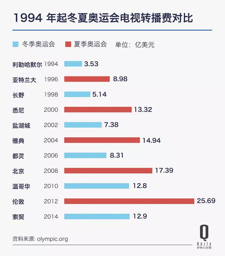 在下面这张表格中,我们罗列了1994 年起历届冬、夏季奥运会的电视转播费。