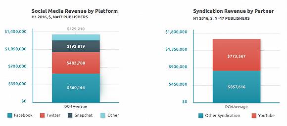 平均而言,2016上半年,媒体在Youtube上通过内容分发获得77.3567万美元,在Facebook上赚了56.0144万美元,Twitter为48.2788万美元,以及Snapchat为19.2819万美元。
