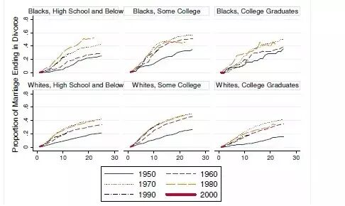 横轴是结婚年限,纵轴是离婚人群比例,六幅图依次表示高中及以下学历黑人女性、受过部分大学教育的黑人女性、大学毕业的黑人女性、高中及以下学历白人女性、受过部分大学教育的白人女性、大学毕业的白人女性。