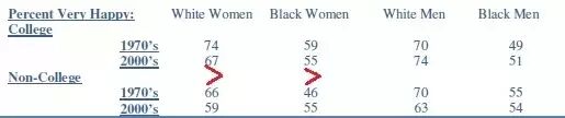 70 年代上过大学的黑人女性认同婚姻幸福的比例也高出未上过大学的黑人女性 13 个百分点。