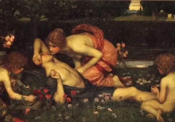 在希腊神话中,美丽的爱神阿芙洛狄忒爱上了美少年阿多尼斯。热爱打猎的阿多尼斯在一次狩猎中被野猪咬破了脚上的动脉,鲜血喷涌而出。阿芙洛狄忒从远处听到阿多尼斯的惨叫声,不顾山谷里白玫瑰的尖刺,一路跑去营救她的情人。带刺的玫瑰划破了阿芙洛狄忒嫩白的皮肤,鲜血滴落在白玫瑰上,染出了血色的红玫瑰。然而一切都无济于事,阿多尼斯还是躺在阿芙洛狄忒的膝盖上死去。从此红玫瑰被用于象征爱情。