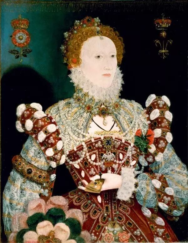 ▲伊丽莎白一世的画像。身后挂毯上绣着三朵玫瑰花。