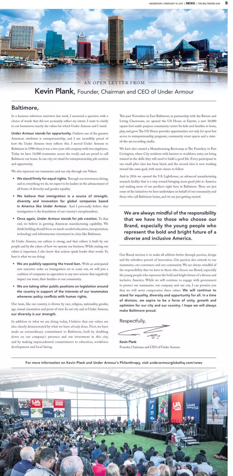 品牌的三位代言人:斯蒂芬·库里、演员巨石强森、芭蕾舞蹈家 Misty Copeland 都出来表态反对,让这场闹剧很快演变成了一次公关危机,人们像抵制超级碗期间引发争议的百威啤酒那样,在 Twitter 上叫嚣着抵制 Under Armour。而 Plank 的回应也显得很笨拙,他在公司总部所在地巴尔的摩的报纸《巴尔的摩太阳报》上刊登了整版公开信,来澄清自己只是支持特朗普在国内就业方面的政策,并重申品牌的理念。