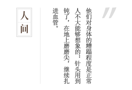 他们对身体的糟蹋程度是正常人不大能够想象的:针头用到钝了,在地上磨磨尖,继续扎进血管;有时被凝血堵住了,就用牙签通一通;即使有“要用开水烫一下”的常识,在当时的条件下也顾不上了。HIV这个直径100纳米的病毒,犹如搭上一列快车,从一个人的血管,游到另一个人的。