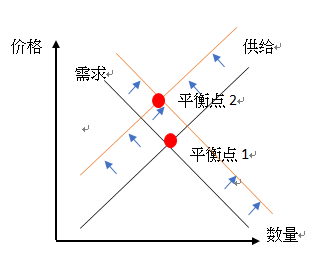 所以咱们需要把供给和需求线往上平移,在供给减少和需求增加的情况下达到了新的平衡点2,此时价格明显升高了,也即是说同样的男生需要更高的条件才能俘获芳心。