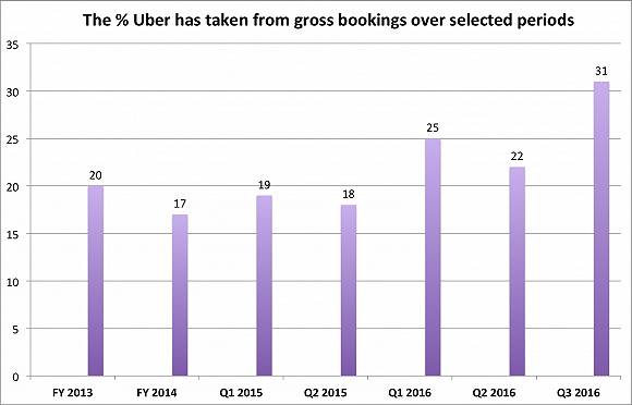 Uber从这些车费中提成比例也较为强势,据界面新闻在硅谷对司机的随机调查中,Uber在总收入中会收取25%以上的提成,以及对每单会征收一笔固定的“基本搭乘费”,提成比例甚至能够达到30%以上,Business insider的报道披露出的数据也证明了随机调查的数据和趋势——在2016年,这种抽成比例甚至会达到31%以上。