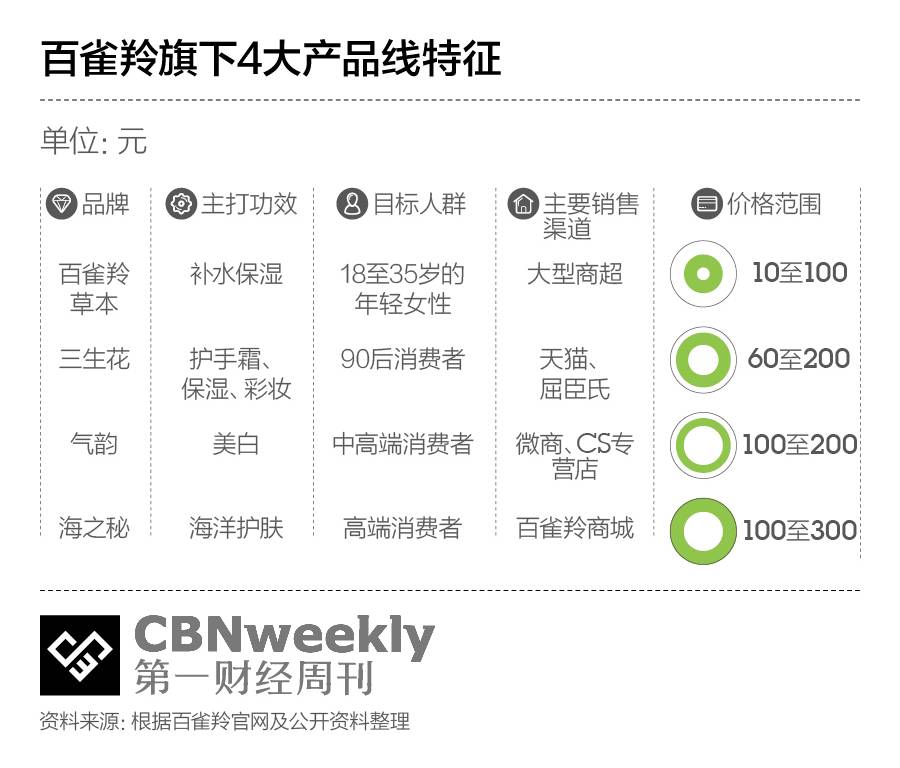 在百雀羚品牌之外,2010年8月,定位中端、主打美白功效的“气韵”上市,2013年推出专门针对电商渠道和年轻消费者的“三生花”品牌,而2015年则是以“海洋护肤”主题的新品牌——“海之秘”。