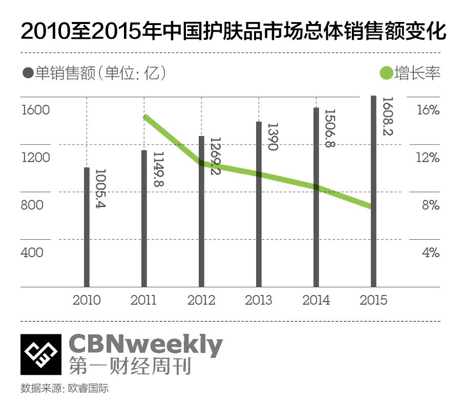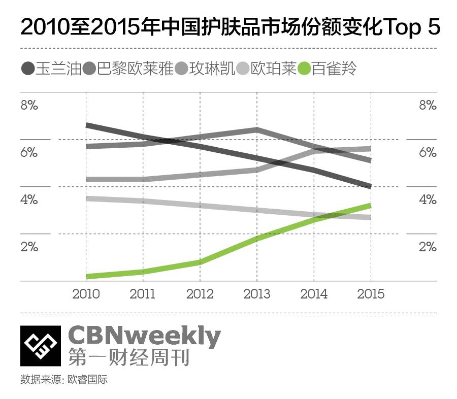 回顾近5年,整个中国护肤品市场的增长率不到10%,而百雀羚却保持了每年3成左右的销售额增长。欧睿咨询的数据显示,百雀羚的市场份额已经从2010年0.2%上涨到了2015年的3.2%,仅次于玫琳凯、巴黎欧莱雅、玉兰油3个外资品牌,排在行业第四位。