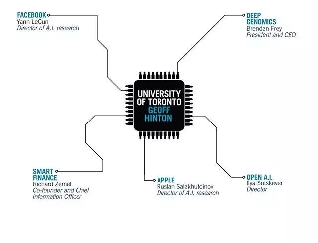 ▲ 辛顿的部分门生(从左上始逆时针:脸书,彦·乐康,AI研究总监;SmartFinance,理查德·泽摩,创始人及首席信息官;苹果,鲁斯兰·萨拉克霍特迪诺夫,AI总监;OpenAI,伊利亚·苏特斯科瓦,总监;DeepGenomics,布兰登·弗莱,总裁CEO)