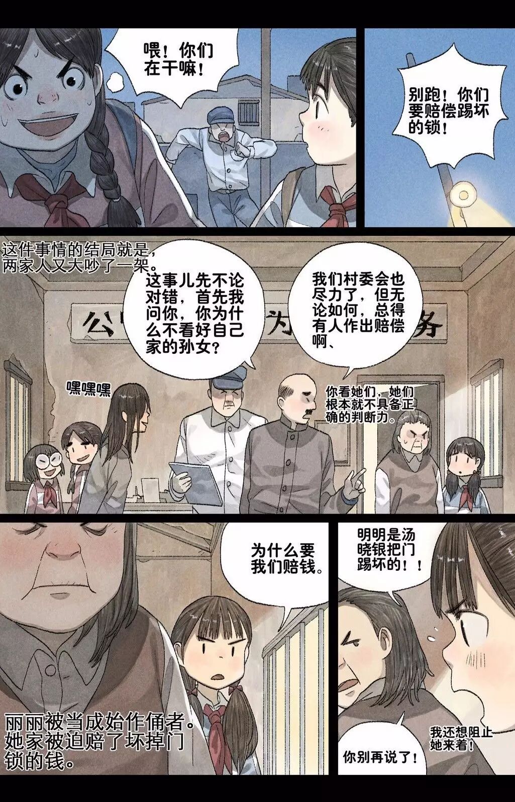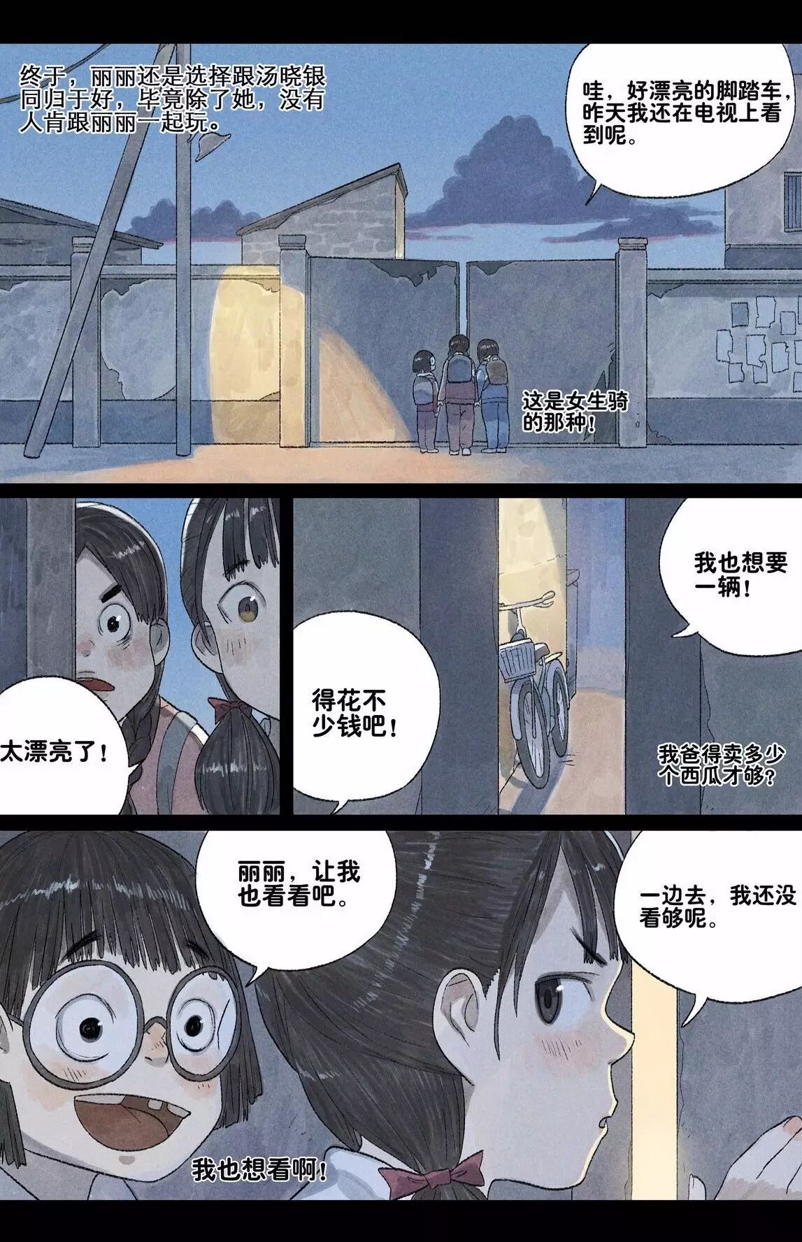 反正她们三个在一起,总没什么好事发生。一个月前她们放学回家,看到一户人家的院子里有一辆漂亮的脚踏车,粉红色的,丽丽在电视上看到过这种类型的。丽丽趴在院子锁着的门外,透过门缝看了很久很久,那之后汤晓银不耐烦了,先踢了一脚院门,丽丽随后也踢了,汤晓溪也去踢。不知道她们边笑边踢了多久,院门踢坏了。丽丽终于摸到了这辆无比神气的脚踏车。高兴了没多久,被大人们发现了。