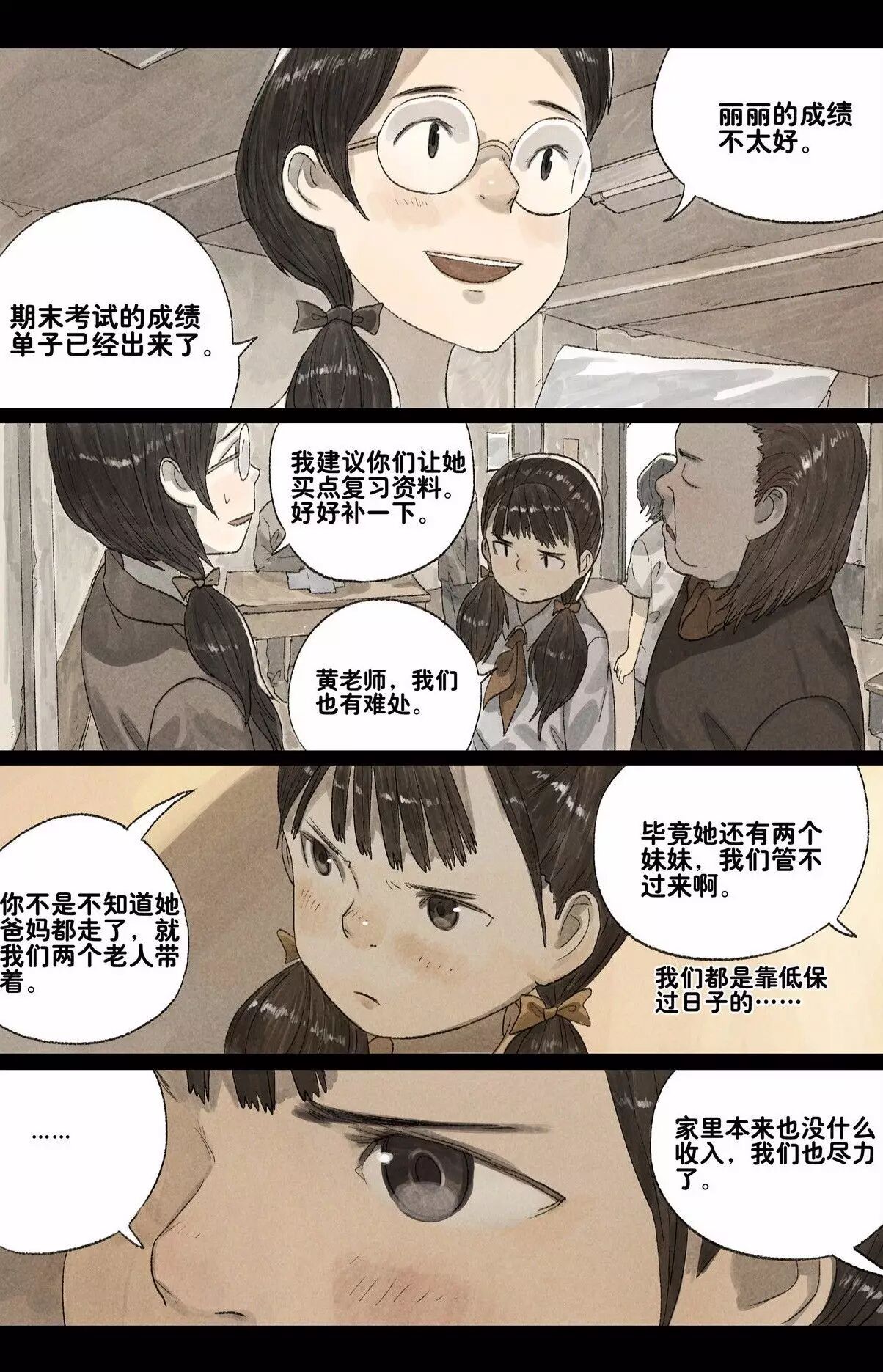 大人们的情绪从来没有瞒过她,甚至连一点点隐藏的想法也没有。六年级开学的时候,丽丽的爷爷带她去交学费,那时候黄婷婷刚接手这个班,提了一句,“丽丽成绩不太好呀,考试都是十几分,要加油哦。”丽丽当时听到自己的爷爷嘟囔了一句,“又不是我们家的孩子。我管她呢。”声音不大,可丽丽听得明白。