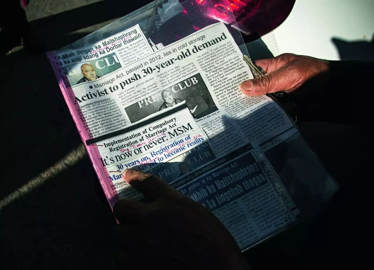 印度梅加拉亚邦西隆市,一位男权活动家拿起一篇报道他的文章。