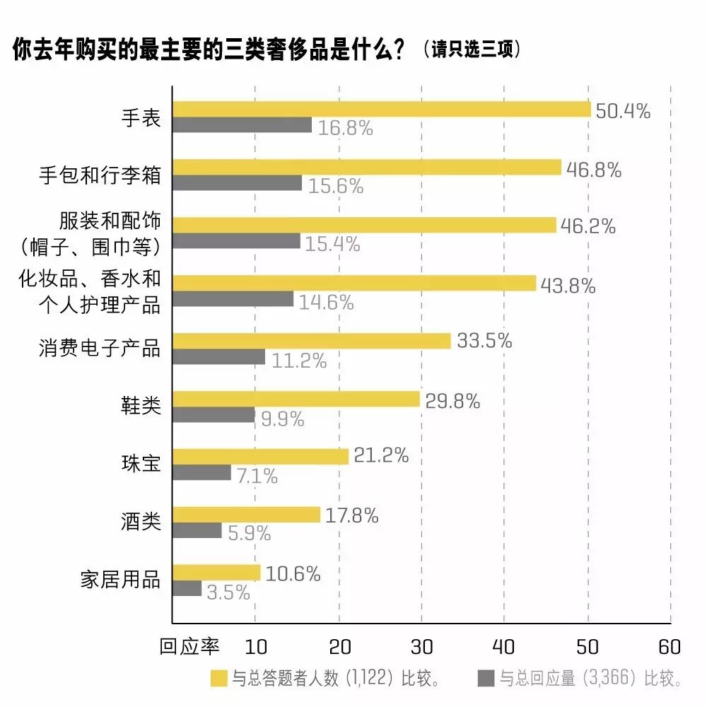 在今年的调研中,我们发现,奢侈品消费者对于产品类别的选择较去年并未出现显著的变化,位列三甲的依旧为:手表(50.36%)、手包和行李箱(46.8%)以及服装和配饰(46.2%)。如若剔除手表类别0.04%的轻微下跌,其余二者皆呈现出大于两个百分点的增幅。化妆品、香水和个人护理产品较去年提升了4.2个百分点;而消费电子产品由去年的38.3%下降了4.8个百分点至33.5%,成为跌幅最大的奢侈品类别;此外,珠宝、家居用品类已经连续三年呈现递减趋势。