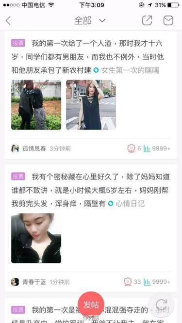 于是我随手点开了情感分区,页面跳转到一个两性相关的子话题,“你的第一次是什么时候”。然后,我的眼前横陈着这样的标题——“我今年小学六年级,我的男朋友晚上叫我去他家,要和我啪啪啪,你们觉得我去吗,他对我是真心的。”然后还发起了一个投票,叫“啪啪啪的理由”,帖子还附上了看起来只有十多岁的小女孩的3张自拍。