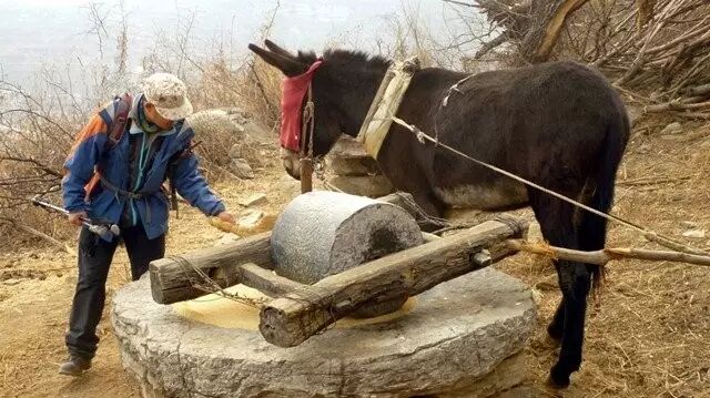 第一次见到二哥,他在抱着碾子杆在推磨磨豆腐。别的地方磨豆腐,都用驴,没有驴的话就用匹矮马,还得用块布把眼睛蒙上。可二哥一人转,一边推磨,一边往里加水。挺新鲜的,就多看了他两眼。