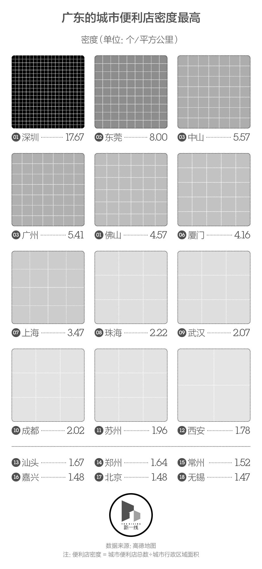 用城市便利店总数除以城市行政区域面积,可以计算出城市的便利店密度。从上面的结果中可以看到,深圳的便利店密度最高,每平方公里平均有17家便利店,是便利店总量第一的广州的3倍还多。