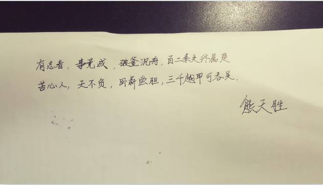 新员工在清理小熊宿舍时,发现了一张字条,兴匆匆的拿给我看,问道:“这里以前住的是谁啊,现在在哪个部门当领导?”我接过纸条一看,上面写的一副对联:“有志者、事竟成,破釜沉舟,百二秦关终属楚;苦心人、天不负,卧薪尝胆,三千越甲可吞吴。”落款熊天胜。