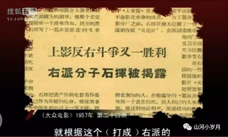 “解放以来,石挥随时随地,从讲笑话、说相声到写文章、拍电影,不放弃任何机会,千方百计地诬蔑、讽刺和咒骂党,反对党的政策和党的文艺路线。在鸣放期中,他更认为‘翻身’的时机已到,猖狂地发表各种反党反社会主义的言论和文章,喷吐出蕴蓄在他胸中的毒液。” ——张骏祥