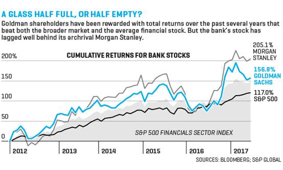 今年4月,高盛公布的2017年第一季度业绩令人失望,进一步放大了这些问题。在高盛预期将占据统治地位的债券交易市场,其公布的收入增长(1%),与主要银行业竞争对手强劲的两位数增长相比,显得黯淡无光,令人震惊。这也让华尔街不禁担忧:投资者和分析师们纷纷猜测,当其他银行都在连续的特朗普行情中赚得盆满钵满的时候,强大的高盛为什么会犯下如此严重的错误?到底发生了什么?高盛股价在3月份达到接近每股253美元的历史最高价,但在6月初跌至约212美元。