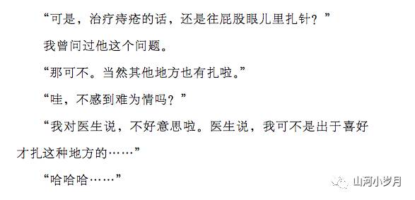 她喜欢他得了痔疮,要自己给屁股打膏药。因为害羞,他把房间的灯关了。后来,朋友介绍他去针灸,他治疗回来,夫妻两个人的对话是这样的: