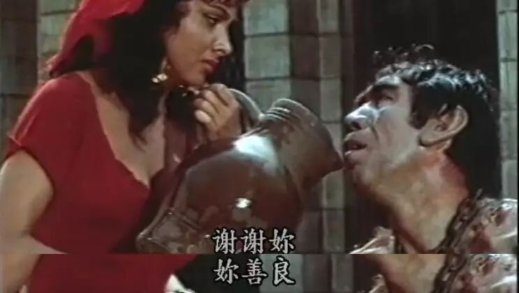 加西莫多被示众于烈日之下,唇焦舌燥向众人求水喝,但众人嘲弄他,只有爱丝美拉达举起水壶喂他喝水,他并不会表达,只是流着眼泪一直重复着“谢谢你,你善良。”