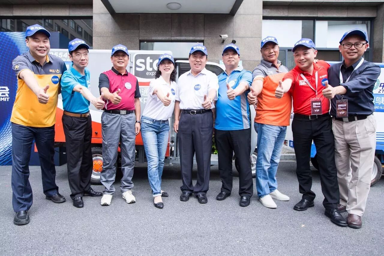 6家中国主流快递企业负责人在参加由菜鸟网络主办的全球智慧物流峰会期间,脱下西装给消费者送快递