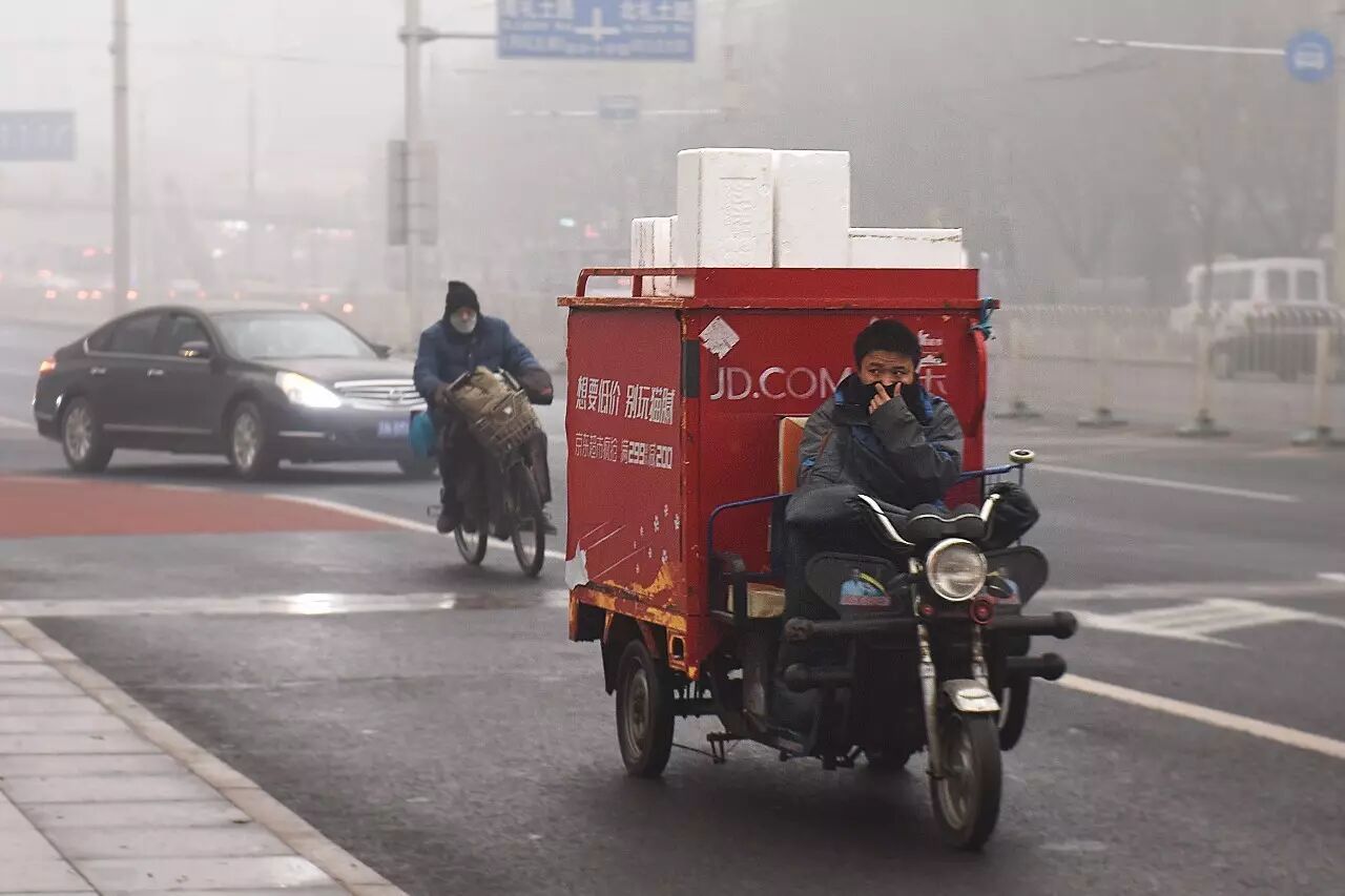 雾霾天气中送货的外卖小哥。