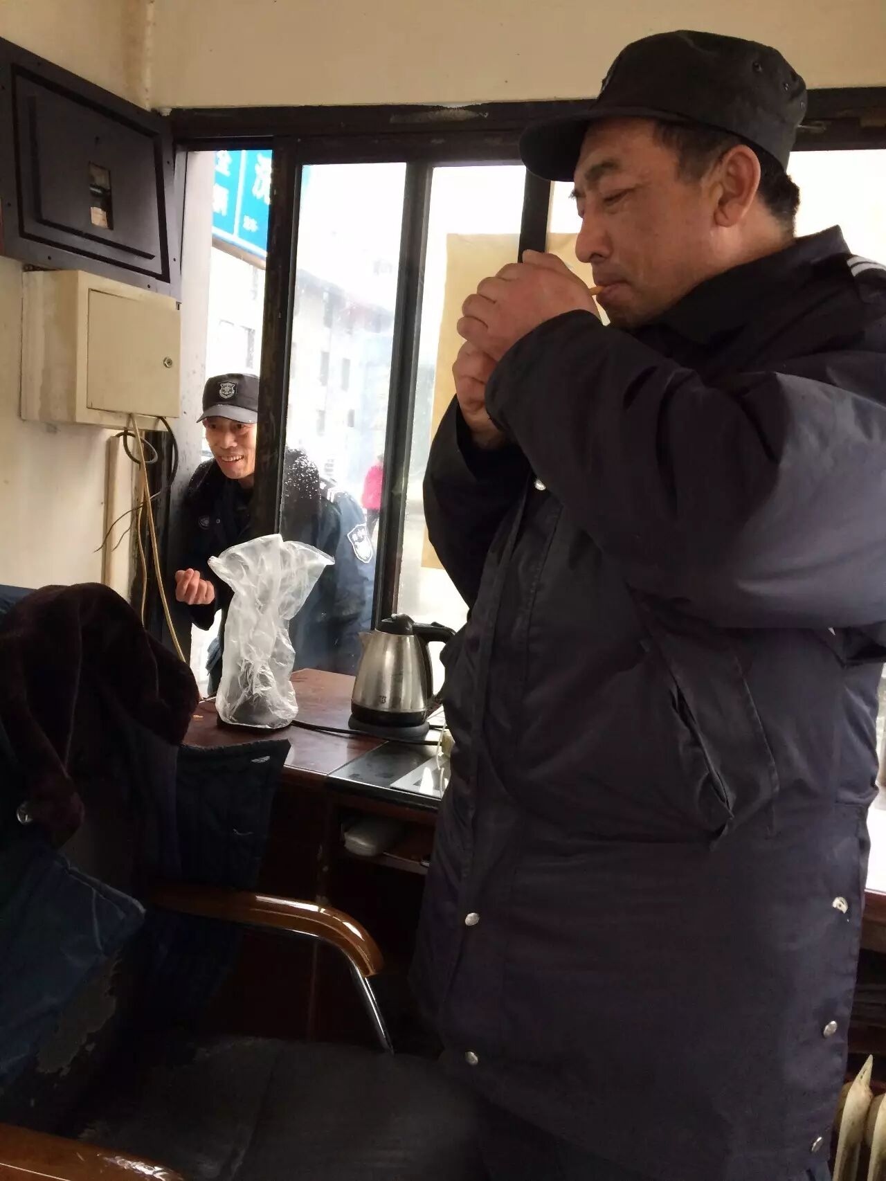 保安亭里,老释在和同事们说笑
