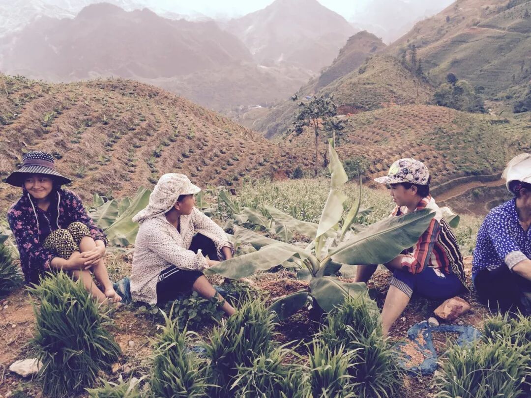 回家路上,背篓的母亲倚靠草坡歇息,遥望越南口岸的方向。头发失去头巾包裹,被国境线来的风吹乱了。