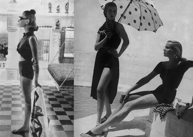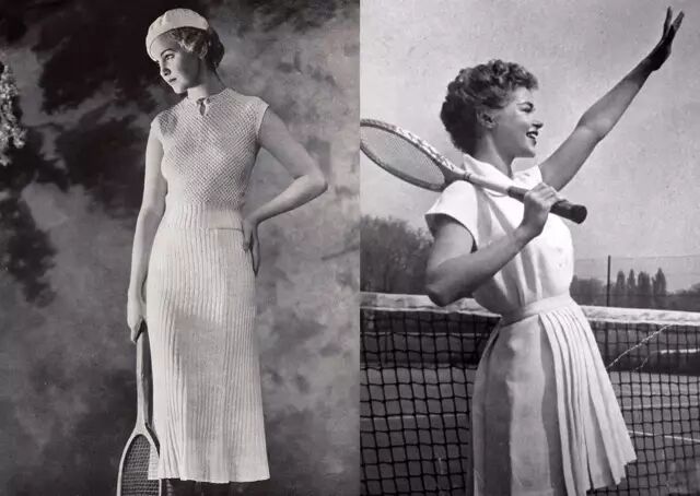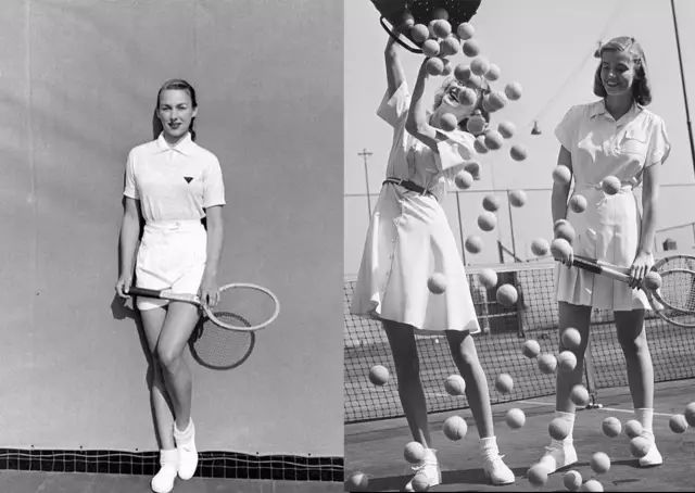 我觉得这个照片非常吸引我的地方的是,当时在50年代,大家在运动的时候并没有穿着那些机能性的面料,也没有因为运动特意穿着更舒适更方便的衣服。她们还是照样穿着一些小西装领、百褶裙、高腰裤,甚至是看上去没有那么方便活动的衣服。
