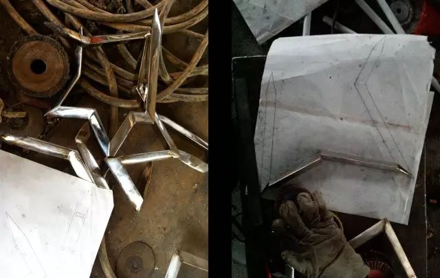 这些符号锋利般的感觉也沿用到配饰的设计里面。这个是镜面不锈钢。图片是我在工厂里面通过锻造的手法把这些想法拼接起来。