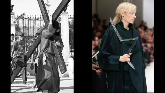 你们看这张图上面这个狂热的异教徒,他就是背着一个十字架。这个形态后来也运用到我们的服装当中。