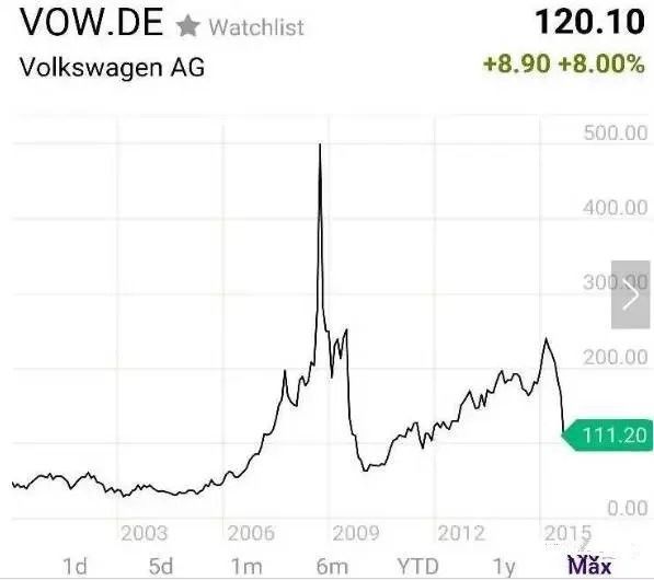 大众公司的股价两天之内暴涨500%,从200欧元暴涨至1005欧元,大众公司的总市值超越当时的埃克森美孚,成为全球第一大公司……