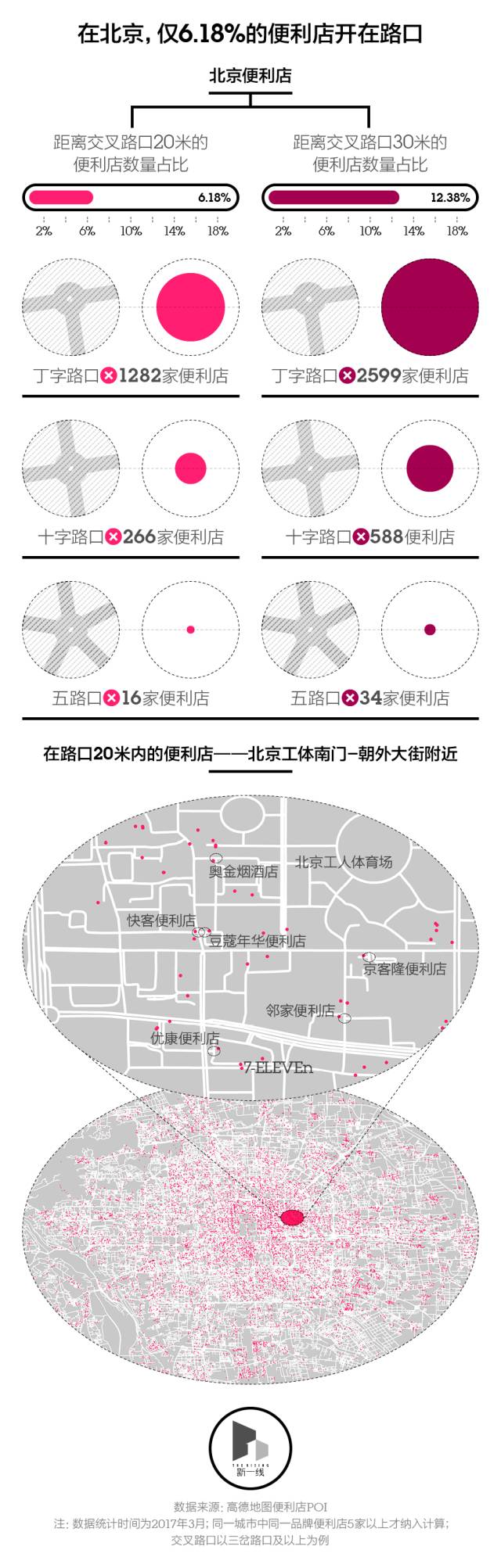 但并不是每家便利店都能找到如此理想的位置。考虑到手边没有深圳的路网图,新一酱暂时找了一份北京路网图来验证。在计算了选址在路口的便利店比例后,新一酱发现北京仅6.18%的便利店开在交叉路口20米的范围内——也就是标准的“路口”。而这些路口便利店大部分都开在丁字路口。