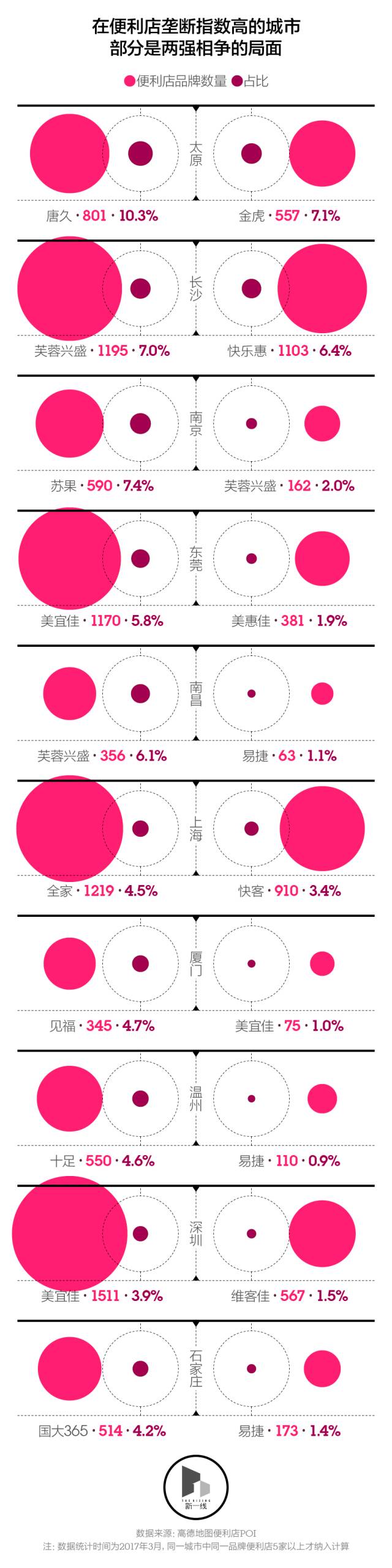新一酱在计算之后得到的结果是,太原、长沙、南京、东莞的赫希曼指数排名前四,而人们印象中便利店多的上海和深圳,垄断指数并不高——这不难理解,沪深两城拥有更丰富的连锁便利店品牌。不过如果根据美国司法部利用赫希曼指数作为评估某一行业集中度的指标时定出的“>0.1为垄断”的标准,中国城市的便利店市场还都处在充分竞争之中。