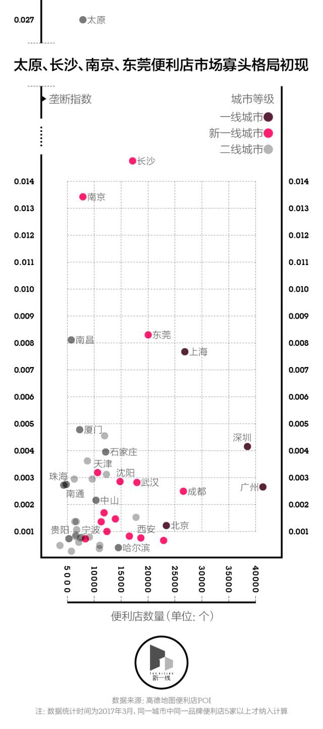 新一酱之所以挑选长沙和太原这两个城市来研究便利店竞争格局,是因为在所有一线、新一线和二线城市中,它俩的便利店赫芬达尔指数最高。