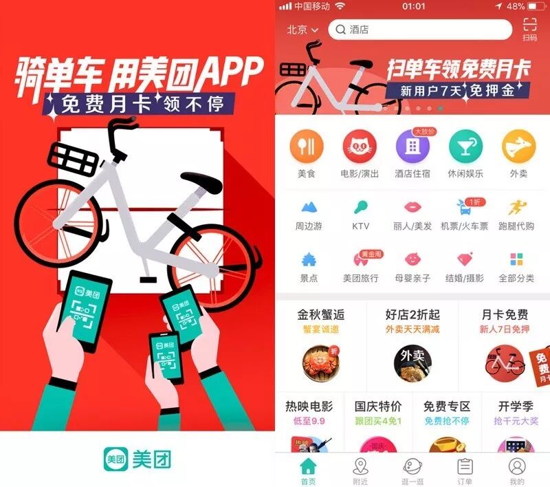 在今年十一假期之前,美团和摩拜已经达成合作,当时是美团为摩拜开放接口,用户在美团首页点击右上角“扫一扫”功能,即可扫描摩拜单车二维码使用共享单车服务,该功能甚至支持摩拜的月卡、新用户免押金等活动。
