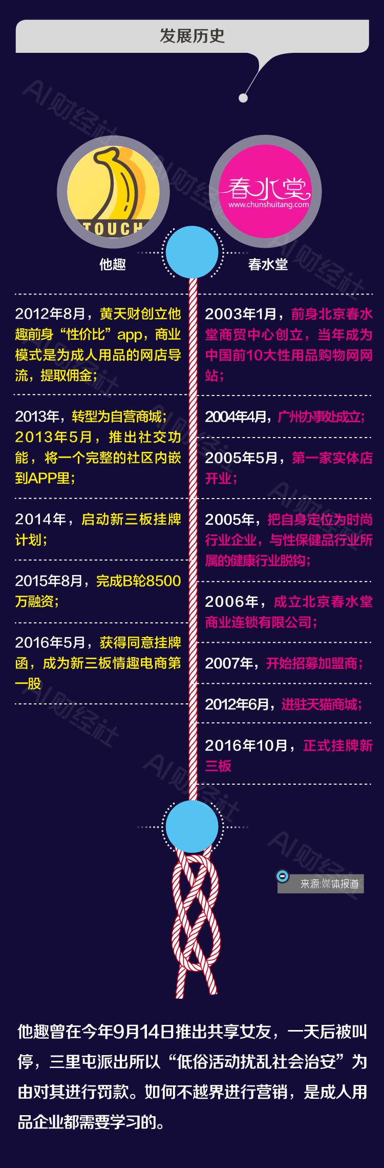 与成人用品实体店进入中国的艰难曲折相比,成人用品电商在中国的发展格外顺利。1999年,国内最早的B2C电商8848上线,一年后,中国首批成人用品电商陆续开始运营。2016年一年间,爱侣健康、他趣、桃花坞、春水堂这四家情趣产业公司先后登陆新三板。易观智库发布的《2017中国情趣电商市场分析报告》显示,2016年我国情趣用品B2C企业交易规模突破了100亿元,较上一年增长88.7%,预测2019年中国情趣用品市场规模将达到389.2亿元。