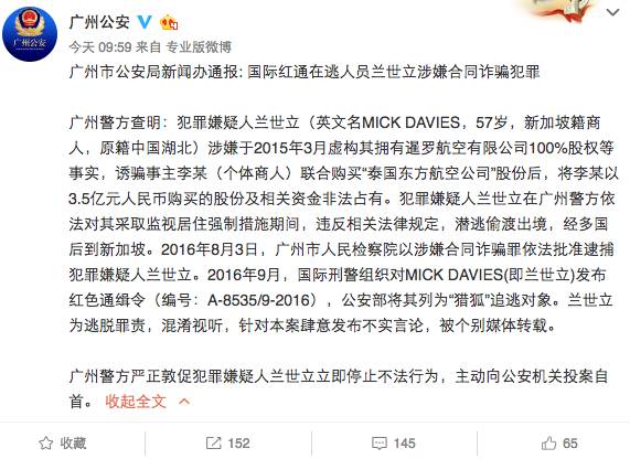 紧接着,海平面以下的冰山开始显露,事件变得复杂起来。11月16日,广州公安官方微博发布通报,称“国际红通在逃人员兰世立涉嫌合同诈骗犯罪”,而这起诈骗案刚好跟兰世立所控诉、泰国东方航空以及麦趣尔的李氏三兄弟有关。通报显示,早在2016年8月3日,广州市人民检察院以涉嫌合同诈骗罪依法批准逮捕兰世立,9月,国际刑警对兰世立发布红色通缉令,公安部将其列为“猎狐”追逃对象。在此期间,兰世立潜逃偷渡出境,经多国后到新加坡。(兰世立为新加坡国籍,原籍中国湖北)