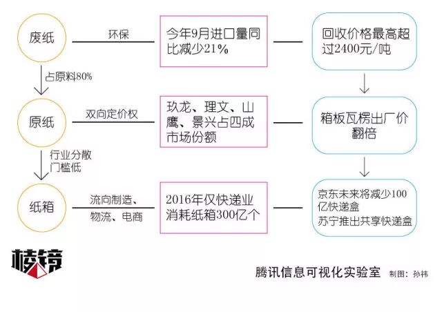 以快递包装所用箱板瓦楞纸为例,废纸占到了整个原材料的80%-90%。去年开始,受环保政策影响,国内开始大幅度限制进口废纸流入,2016年,废纸原料中进口量2850万吨,国内废纸量5000万吨,进口废纸占比下降到34%。 原料紧张阴影下,一年时间,洛阳纸贵。