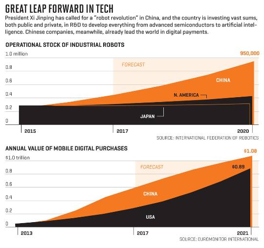 中国会主导未来的技术吗?中国政府采取了强有力的措施,推动人工智能的发展,并鼓励使用工业机器人。目前中国的“机器人密度”依旧落后。据国际机器人联合会(International Federation of Robotics)统计,2016年,中国每万名制造业工人中只有68台机器人,而韩国为631台,德国为309台,日本为303台,美国为189台。但中国自2013年以来一直是全球最大的机器人买家。去年,中国采购了约87,000台机器人,约占全球机器人销量(294,000台)的三分之一。中国的规划者们制定了到2020年将工业机器人比例提高到每万名工人配备100台机器人的目标。习近平同时呼吁在中国进行“机器人革命。”
