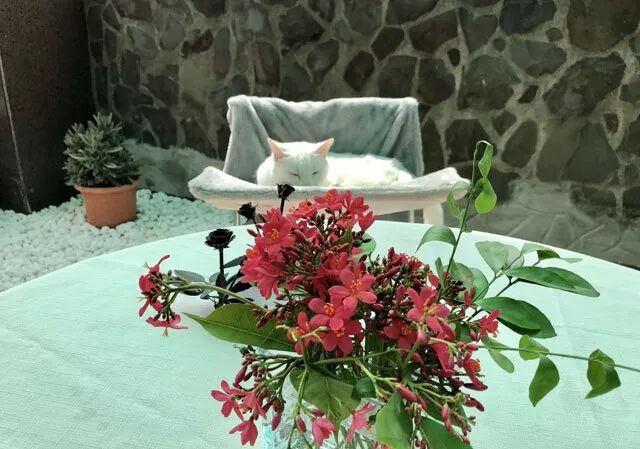 阳台上还有猫。美君,它刚才还趴在你身边,利用你的体温给自己发电,猛打呼噜。闭着眼的你抓抓它,不知道是猫,把它毛茸茸的头当做网球开始捏起来,它就逃走了。阳光点亮了阳台,现在它在阳台上做日光浴。