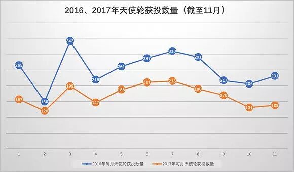 天使轮的项目融资笔数明显减少,从2016年的2779笔锐减到今年的1866笔。