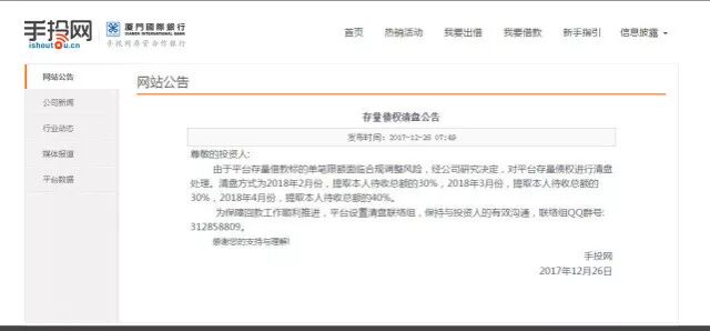 该平台的存量债权清盘公告称,由于平台存量借款标的单笔限额面临合规调整风险,经公司研究决定,对平台存量债权进行清盘处理。清盘方式为2018年2月份,提取本人待收总额的30%,2018年3月份,提取本人待收总额的30%,2018年4月份,提取本人待收总额的40%。