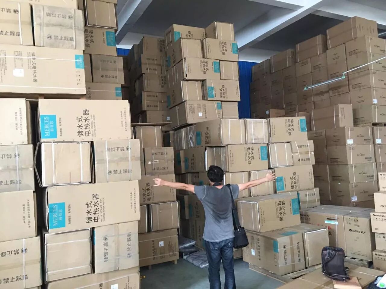 这是一个占地几千平方米的仓库,仓库内部顶高超过5米,站在门口看不到尽头,包装完好的家电箱密集地填满整个空间。“成千上万个箱子,比你去过得任何一家苏宁或者国美电器城都要大,从电热水壶到洗衣机冰箱应有尽有,一眼看过去很震撼。”