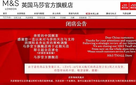 在关闭中国内地门店、打包出售港澳店铺后,英国最大服装零售商马莎百货要把它的天猫旗舰店也关掉了。